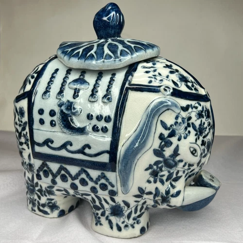 Vintage Chinoiserie Blue White Porcelain Elephant Lidded Ginger Jar Hand Painted