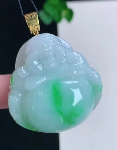 18K Yellow Gold Grade A Icy Green Jade Jadeite Pendant Buddha 0322