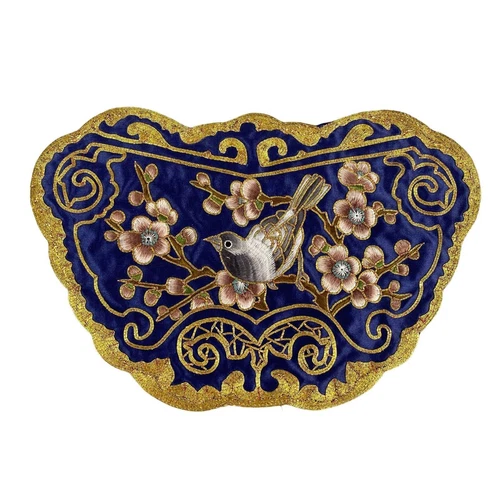 Hand Embroidered Silk Scalloped Blue Background with Bird (READ)