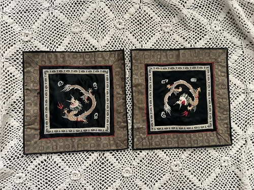 Set Of Two Antique HandcraftedEmbroidered Silk Dragon Tapestrys Chinese Brocade