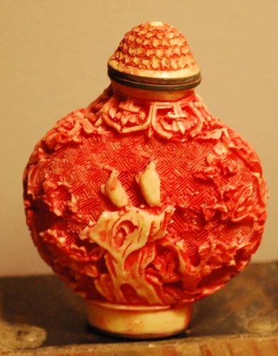 Antique CARVED CHINESE RESIN CINNABAR Snuff Bottle Signed 2.5" Leaves Insects