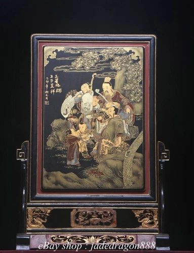 32.4" Old China Marked Nanmu Wood Gilt Human Man Words Tree Pattern Table Plaque