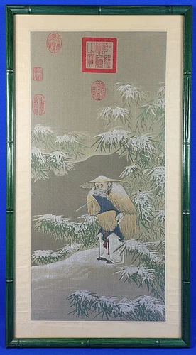 Chinese Rayon Tapestry "Fishing on A Snowy Day" Well Framed