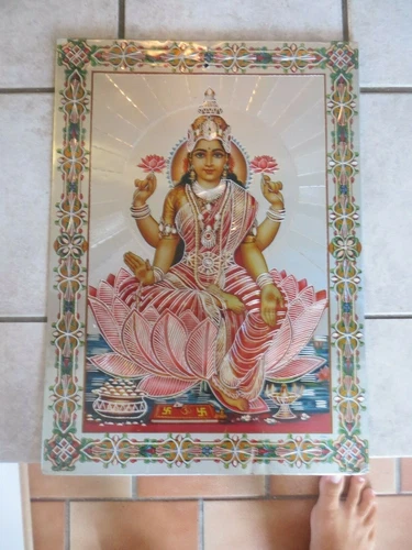 4 Hands Chenrezig goddess, Shilpa, psycadelic tin over cardboard, Kamathenu