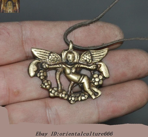 Tibetan Tantra Buddhism Cattle leather Bronze Winged God Buddha Amulet Pendant