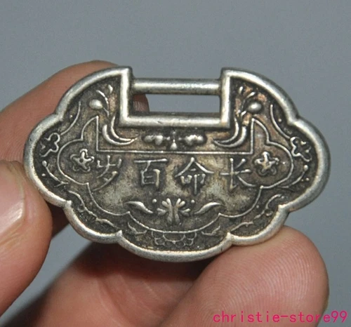 1.4" old China Tibetan silver“长命百岁”mark boys children lock statue amulet Pendant