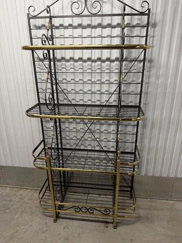 Vintage French Country Gray Wrought Iron & Brass 4 Tier Pastry Bakers Rack