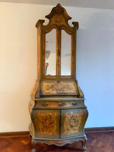 Antique Italian Venetian Secretary Desk HandPainted Bombe Cabinet Mirrored Hutch