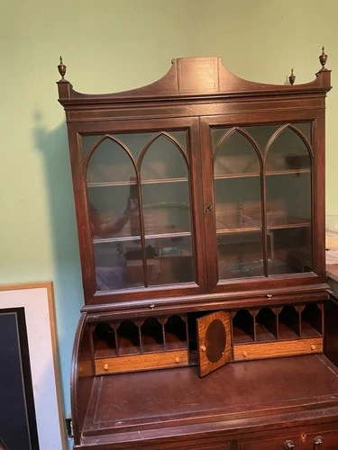 Antique Gothic Revival Secretary Desk Mahogany Wood Glass Doors 2 Drawers