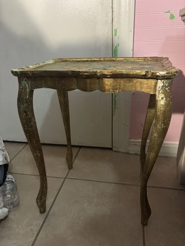 French Style Antique Gold & Green Carved Wood Side Table, Ornate Rectangular