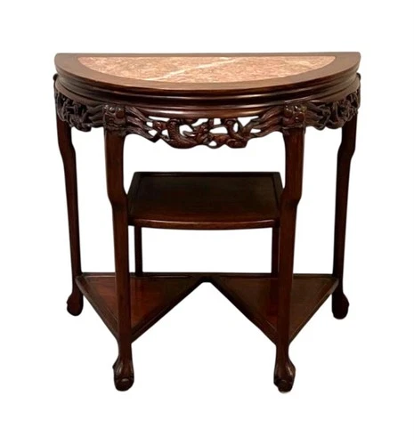 Vintage Oriental Chinese Carved Hardwood Demilune Marble Top Console Hall Table