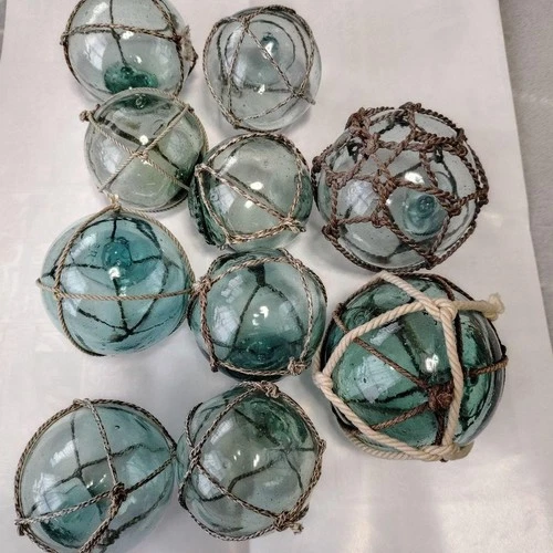 Vintage Japanese Glass Fishing Floats w/ Net Lot of 10 2.4-2.8in Buoys Authentic
