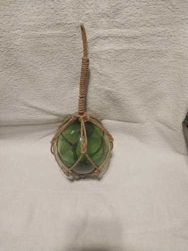 Green Glass Fishing Float with Rope Net, Approx. 6 Inch Diameter