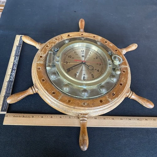 Bey Berk Maritime Nautical Captain Ship Wheel & Porthole 24 hr Quartz Clock 19"