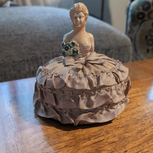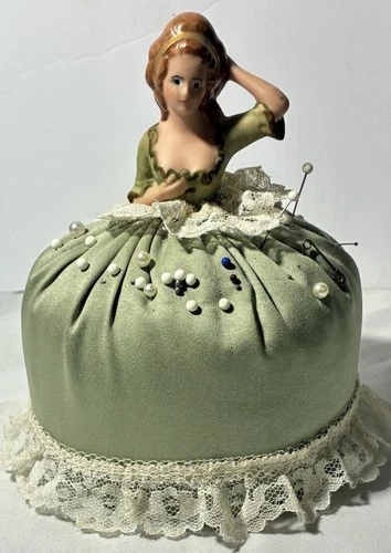 Antique Half Porcelain Doll Pin Cushion Elegant Woman Green Dress