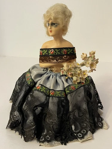 Vintage German Bisque Porcelain Half Doll Pin Cushion With Lace Unmarked
