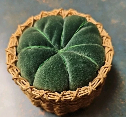 Antique 3.5" PIN CUSHION BASKET GREEN VELVET Vintage PUMPKIN Sweet Ash Grass