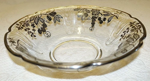 Silver Overlay Glass Bowl Fruit Grapes Berries on Vine Design 8 1/2" Vintage