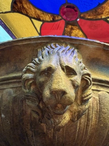 Antique 1900’s Lionshead travertine wash basin iron table marble top lion head