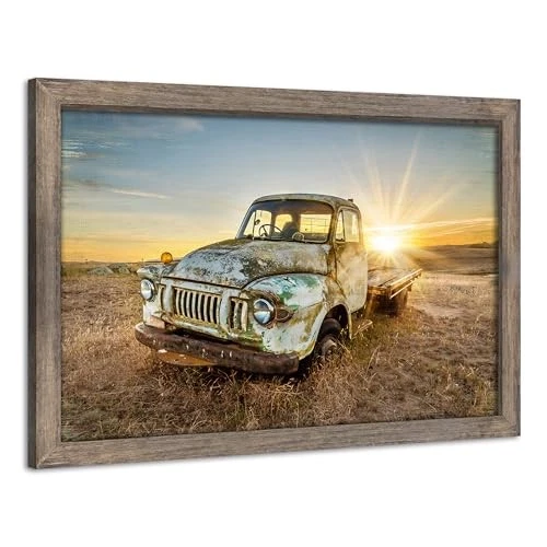 Framed Wall Art: Rustic Countryside Landscape Painting 45"L x 30"W Sunset Truck