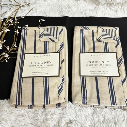 Pottery Barn Courtney Shams Pillow Cases Navy Blue Cream Stripes 2 Pc Set NEW