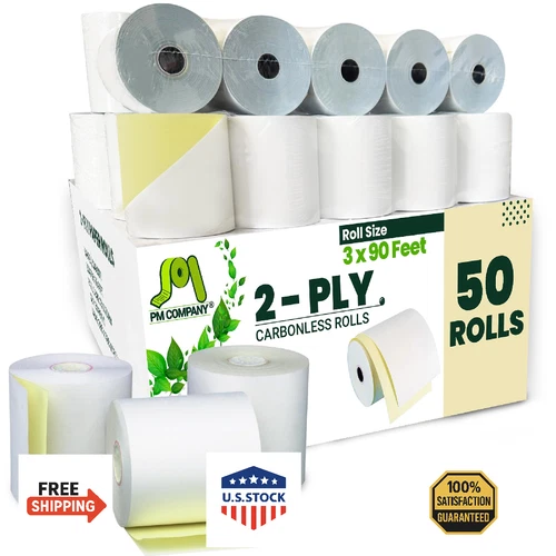 PM Company 2 Ply POS/Cash Register Rolls, 3 Inches X 90 Feet, White/Canary, 50 p