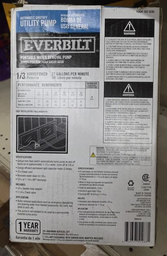 Everbilt Submersible Utility Pump 1/3 HP 27 GPM Automatic Shutoff