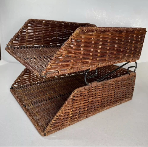 Wicker Double Letter Tray Wire & Rattan Desk Paper Organizer Brown 2 Tier Office
