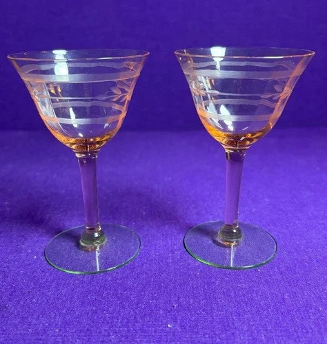 2 Pink Uranium Glass Cordials, Etched Floral Coupe Liquor Cocktail Glasses