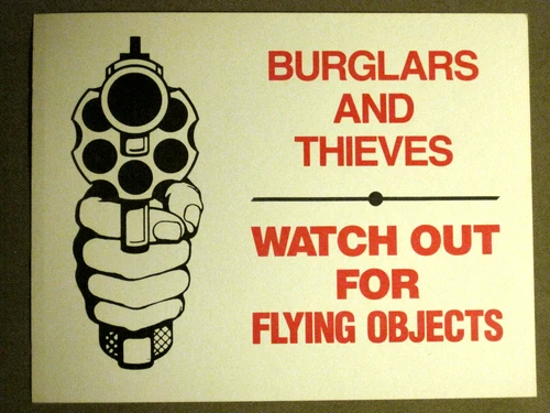 "BURGLARS AND THIEVES WATCH OUT FOR FLYING OBJECTS" 8.5" x 11" SIGN GUN PLACARD