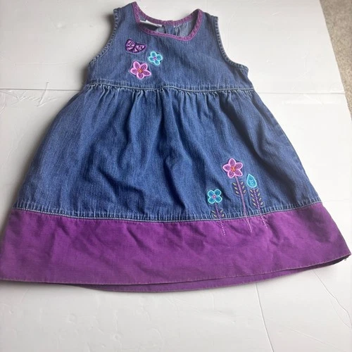 VINTAGE OshKosh Bgosh 3T Denim Purple Corduroy Floral Embroidered Jumper Dress
