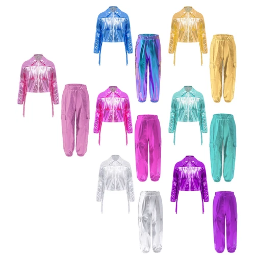 Kids Girls Outfit Breathable Dancewear Sequined Tracksuits Metallic Costume Set