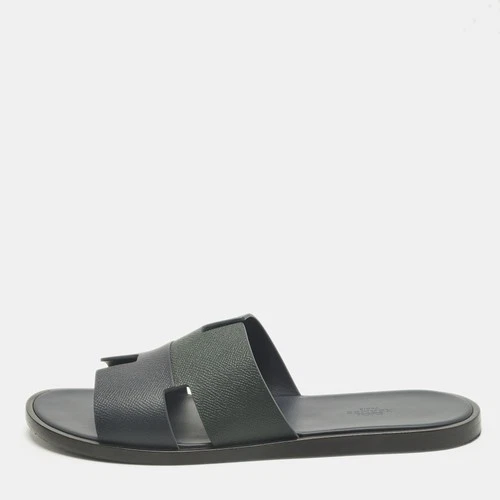 Hermes Izmir Size 44 Navy BlueDark Green Leather Flat Slide
