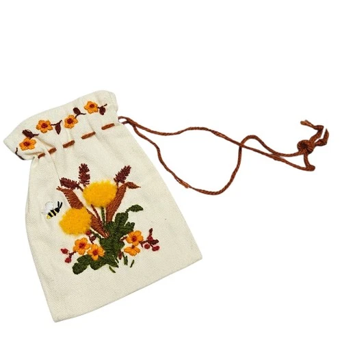 Hand Embroidered Drawstring Pouch Bag Floral Bee Cottagecore Keepsake Gift Indie