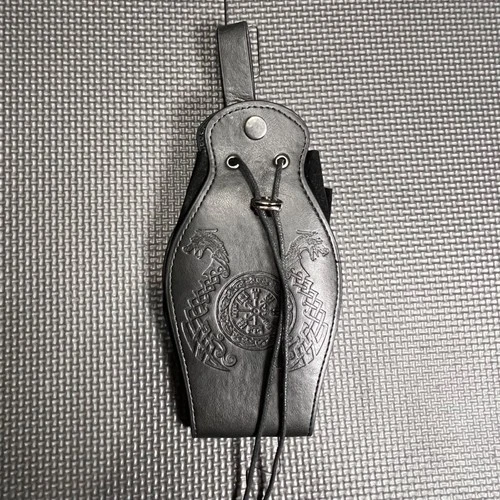 Viking-Inspired Black Leather Drawstring Pouch With Embossed Norse Design & Mult