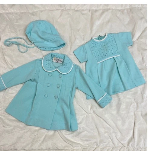 Little World VTG MCM Dress Coat Bonnet Set Baby Sz M Aqua Knit Easter Classic