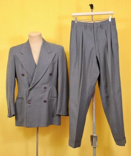 Men's VTG 40s Grey Blue Double Breasted 2 PC Suit Sz L 1940s Wool