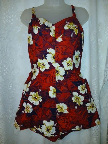 Vintage 60s Royal Hawaiian Tiki Red Hibiscus Polished Cotton Romper Playsuit M