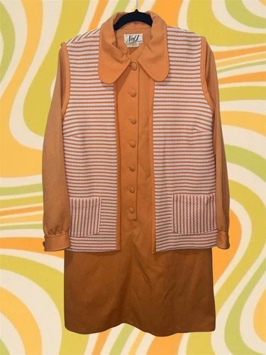 Ned J. 1970s Mod Orange Dress Suit Set with Striped Vest Women's Retro Separates