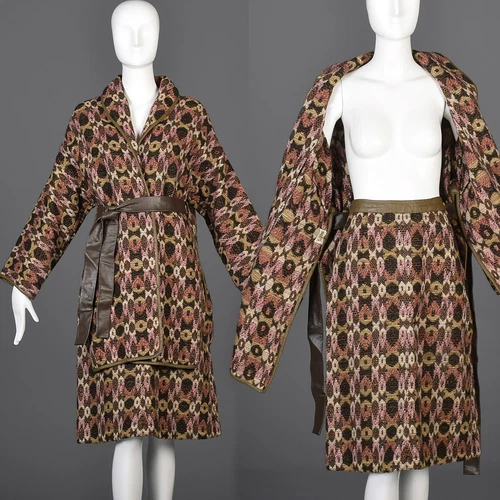 M Vintage 1970s 70s Courreges Winter Coat Skirt Suit Set Outfit Separates Camel