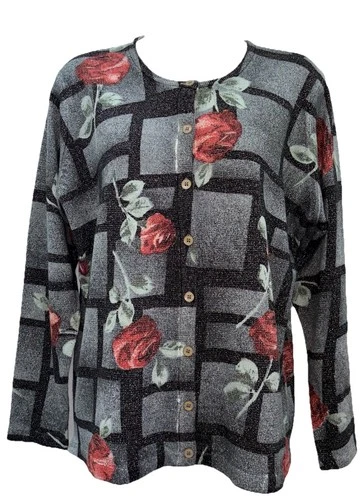 VTG In-Knit Women Size M Button Up Long Sleeve Metallic Floral Cardigan Sweater