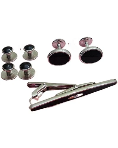 Silver Black Cufflinks Shirt Studs Tie Clip Set Formal Wear Accessories