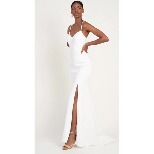 Jenny Yoo Lawrence Antique White Crepe V-Neck Mermaid Gown with Slit and Train
