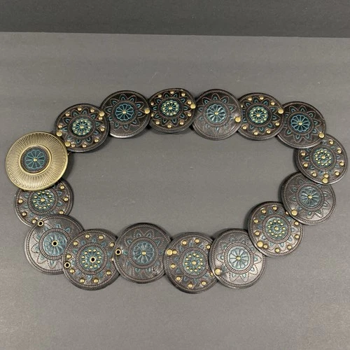 Y2K bohemian boho western disc concho belt brass teal embroidered Cochella Twee