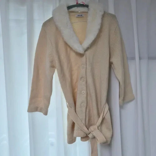 SHELLRR Faux Fur Collar Belt Cardigan in Ivory Official