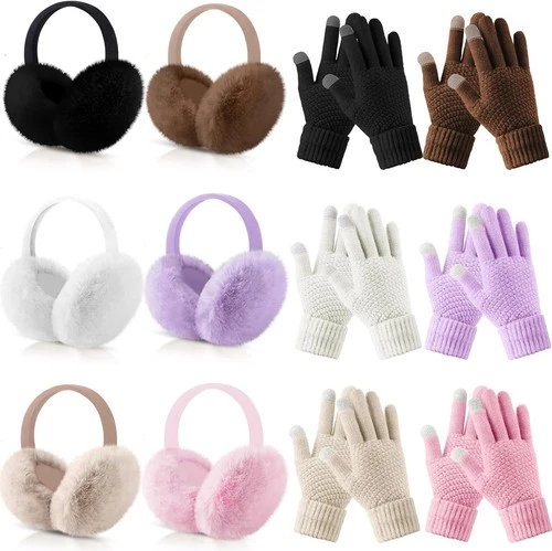 12 Pcs Winter Ear Muffs & Gloves Set Women Girls Faux Fur Warm Earmuffs Fluffy