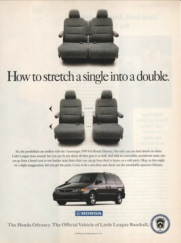 1999 Honda Odyssey Original Print Ad--How to Stretch a Single Into a Double