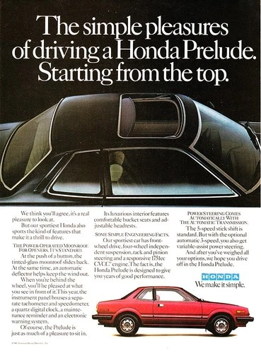 1981 Honda Prelude Sunroof Vintage Print Ad "The Simple Pleasures of Driving..."