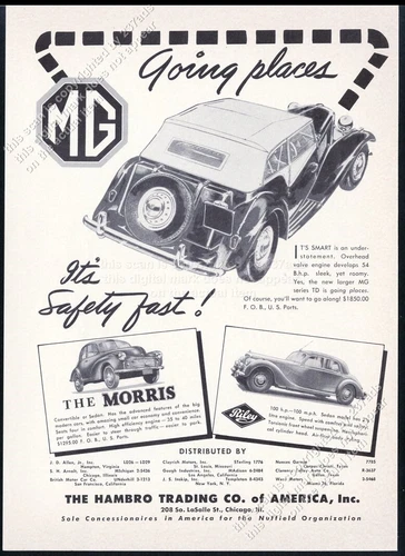 1952 MG Midget TD Morris & Riley car illustration Hambro vintage print ad