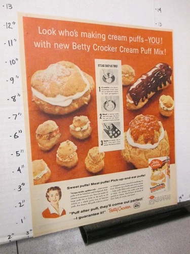 newspaper ad 1957 BETTY CROCKER cake mix box cream puff doughnut baking